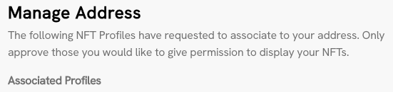 The Manage Address section will display the requested association for confirmation. Confirming the request will have you sign an on-chain transaction to associate your address with the NFT Profile.